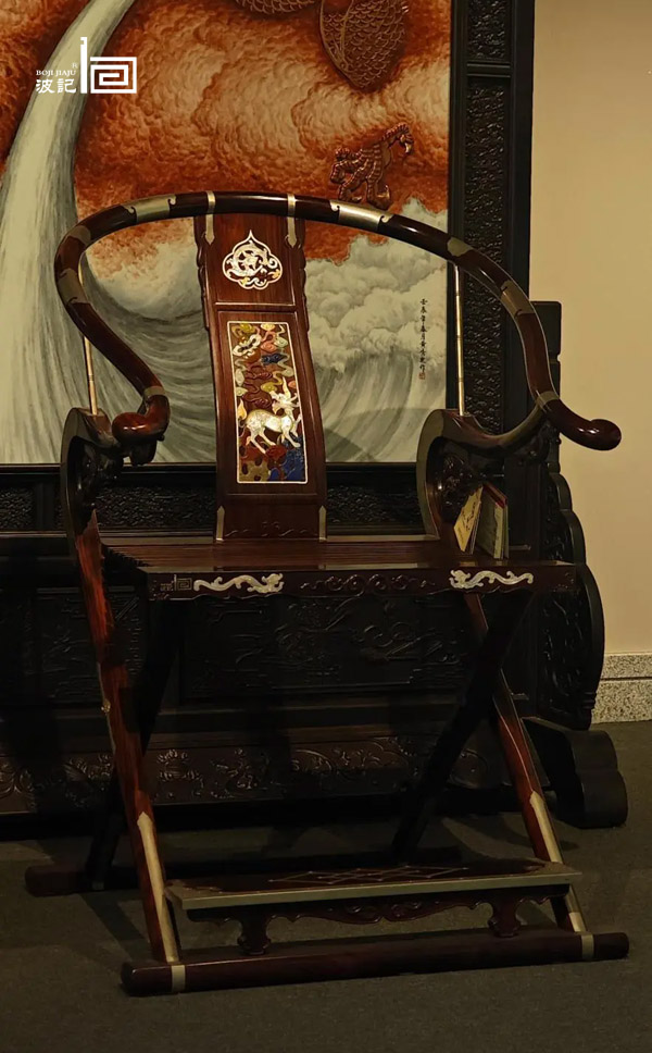 波記家具有一款榮獲“第三屆中山市工藝家具魯班獎”的作品——《大紅酸枝百寶嵌麒麟交椅》,這款交椅承載著豐富的文化底蘊與歷史傳承。
